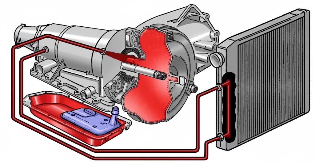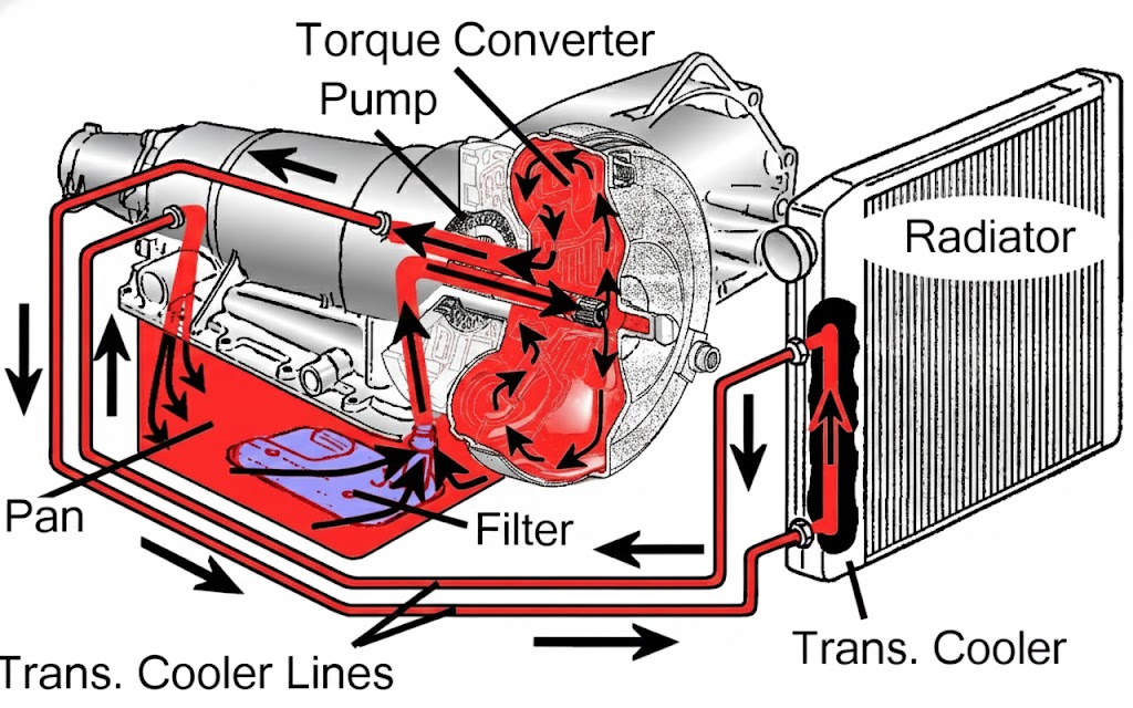 The fluid circulates in the transmission between two main areas, the pan and the torque converter. When the motor is running the fluid circulates from the pan to the torque converter through the cooler lines to the cooler in the radiator and back to the pan continuously.