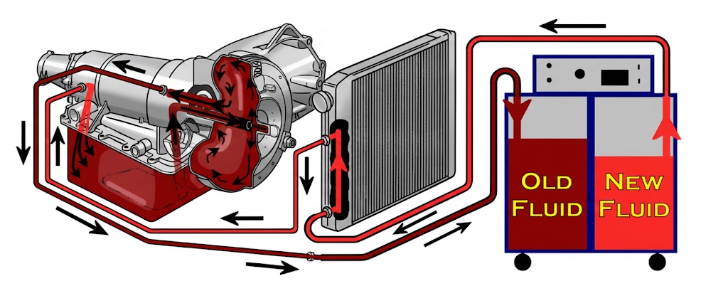 This is the most common method of flushing a transmission at other service facilities. A fluid- exchanging machine is installed in the cooler lines. The old fluid leaves the transmission from one line then new fluid is added through the other line. While this does change some fluid, the old fluid mixes with new fluid and is diluted in the pan. The pan is not being cleaned or inspected for problems, the filter is not being changed and the normal wear sediment is not being removed from the pan. Usually there are no basic checks before or after the service.